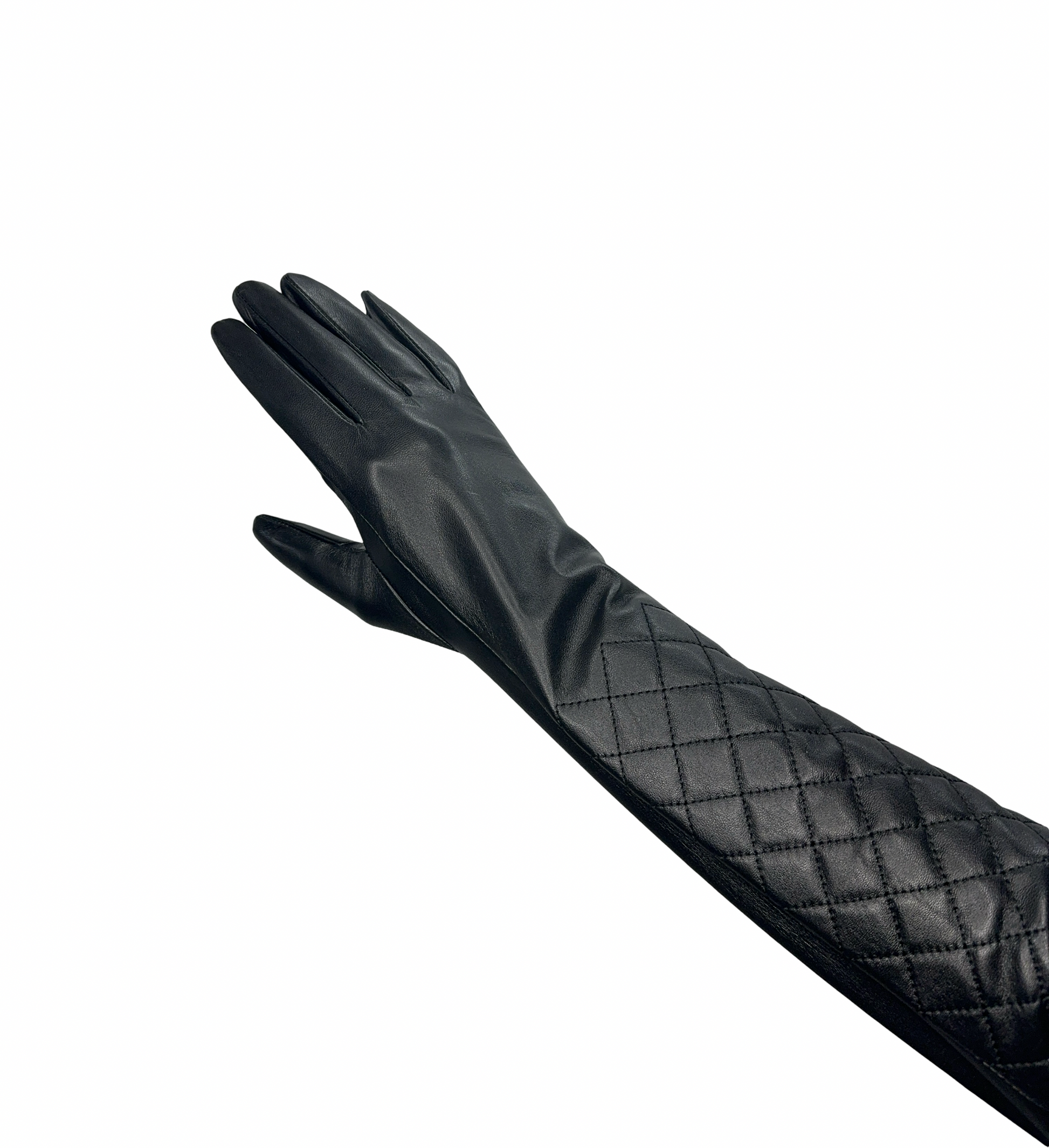 Hvis du søger et unikt og luksuriøst look, så vælg disse sorte lange læderhandsker med smuk quiltet syning. Handskerne er lavet af blødt kalvelæder og har en længde på 46 cm, hvilket giver en sofistikeret og praktisk beskyttelse mod kulden. Den fine syning tilføjer et ekstra element af stil.